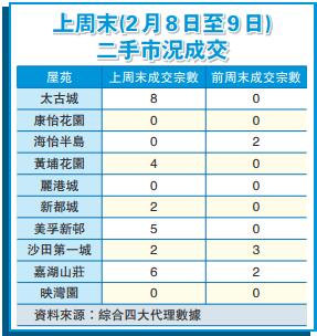 美聯物業表示,樓市觀望氣氛轉濃,惟仍吸引不少剛需客回流二手市場尋寶,該行分行統計,剛過去的周末(2月8日至9日)10大藍籌屋苑錄得約8宗買賣成交,按周增加約1倍,惟仍連續4個周末錄得單位數,表現反覆。