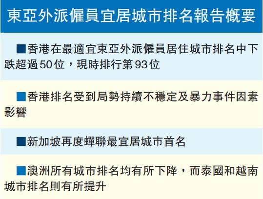 【香港商报网讯】记者潘晶报道:人力资源管理顾问机构ECAInternational昨日发布最新「外派雇员宜居城市排行榜」,当中,香港在「最适宜东亚外派雇员居住城市」排名中急跌52位至第93位,被首尔和台北等城巿超越。此外,持续山林大火的澳洲,因恐袭威胁升级,所有城市排名均下降,而泰国和越南城市排名则有所提升。