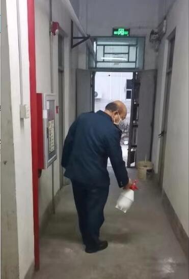 记者来到在位于大亚湾西区街道的嘉瑞科技园的嘉瑞集团看到,背负着消毒液的工作人员正在对门岗、厂房喷洒消毒液,门岗处的门卫戴着口罩,对每位出进的人员进行体温检测。