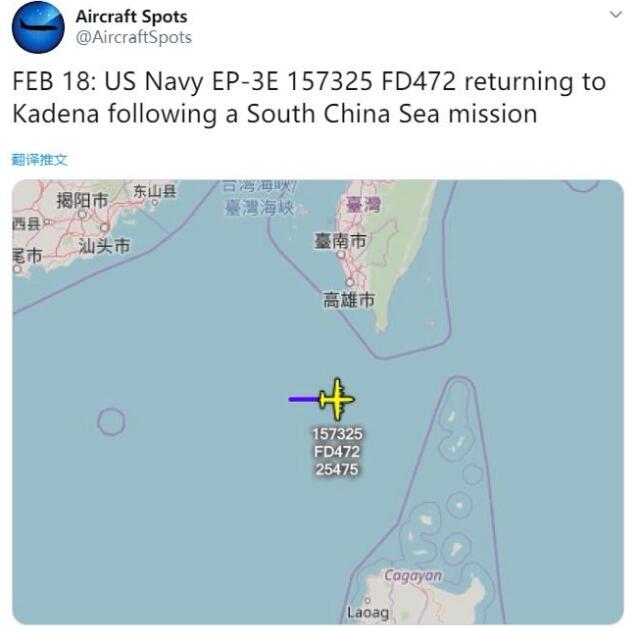【香港商报网讯】根据长期跟踪美军战机动态的推特账号“飞机守望”(Aircraft Spots)2月18日提供的飞行路线显示,一架隶属于美国海军的EP-3E“白羊座”电子侦察机在南海上空进行了飞行,随后返回驻日美军的嘉手纳空军基地。从飞行路上看,该机自西向东飞越南海上空,通过巴士海峡后返回基地。