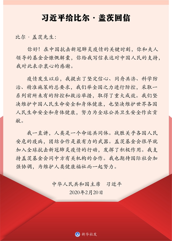 習近平在回信中說,在中國抗擊新冠肺炎疫情的關鍵時刻,你和夫人領導的基金會慷慨解囊,你給我寫信表達對中國人民的支持,我對此表示衷心的感謝。