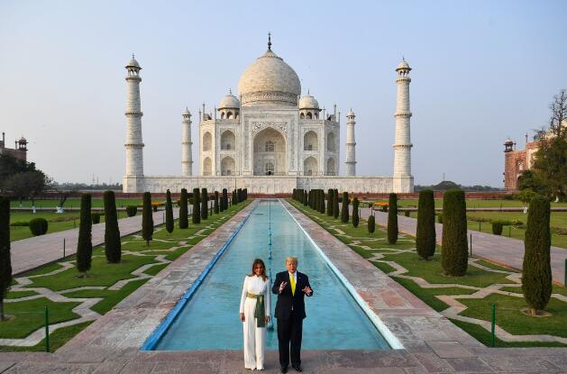 2月24日,在印度阿格拉,美国总统特朗普(右)与夫人梅拉尼娅在泰姬陵前合影。 新华社