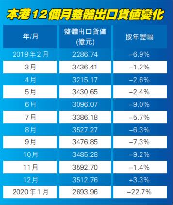 【香港商報網訊】記者鄺偉軒報道:政府統計處昨日公布,香港1月份整體商品出貨值按年急跌22.7%至2694億元,創近11年來最差單月表現,遠遜市場預期;進口下跌16.4%,連跌14個月,亦遠遜預期。分析預料,香港出口何時見底,須視乎新冠肺炎疫情何時受控。