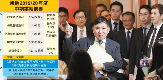 若扣除投資物業公平值變動,新地中期基礎溢利按年減少2.3%至134.22億元。期內,來自香港物業銷售溢利63.35億元,按年增加15%,確認入帳項目包括晉海、PARK YOHO Napoli、匯璽、Grand YOHO及天鑄的住宅項目。