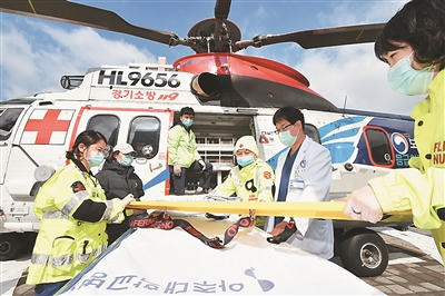 2月29日,韩国京畿道水原市启用应急医疗专用直升机,主要用来救助紧急重症患者。 新华社发