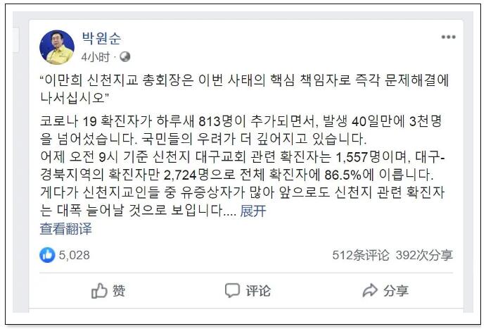 针对韩国新冠肺炎疫情迅速扩散的责任问题,首尔市长朴元淳1日早上公开敦促检察机关逮捕现年88岁的新天地教会教主李万熙。朴元淳在自己的个人社交媒体上向韩国检察总长尹锡悦留言称,现在已经到了检方将威胁国民生命病毒传染源的责任人、新天地教会教主李万熙逮捕的时候了,如果李万熙不采取控制疫情扩散的进一步措施,首尔市将按照既定方针以过失杀人罪等向其提出刑事控告。朴元淳表示,截至2月29日上午9时,大邱新天地教会信徒的确诊人数为1557人,占整个大邱和庆尚北道地区确诊者比例为86.5%,疫情发展到如此不堪地步,李万熙等新天地领导层却不知道躲在哪里。希望李万熙立即公开露面向韩国国民道歉,同时要求其信徒积极配合防疫部门进行检测。朴元淳强调,韩国疫情如此扩散的罪魁祸首就是李万熙和新天地教会领导层。