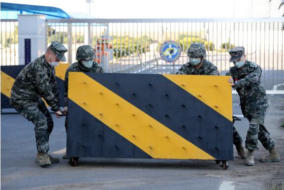 韩国某部队正门前,官兵们设置路障防疫(韩联社)