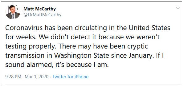 “新冠病毒在美国已经传播了几个星期。我们没有发现它,因为我们的测试不合理。自1月份以来,华盛顿州可能出现了隐性传播。你觉得我恨担忧?现实情况就是这样的。”