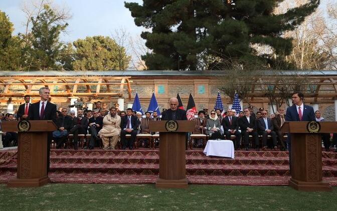 2月29日,在阿富汗首都喀布尔,美国国防部长马克·埃斯珀(前左)、阿富汗总统阿什拉夫·加尼(前中)和北约秘书长延斯·斯托尔滕贝格在新闻发布会上。新华社