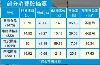 在全球搶購潮下,基本物資一度出現短缺,也帶動快速消費股近日逆市造好。多隻快速消費股如日清(1475)、康師傅(322)以及日用品股如恒安國際(1044),昨日逆市造好,分別升3.06%、3.27%及1.18%。