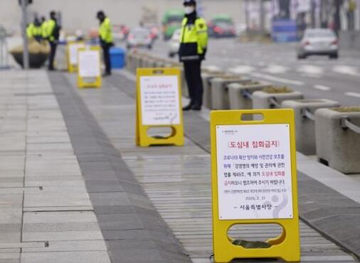 ▲韩国首尔光化门广场树立告示牌,要求“停止集会”。中新社