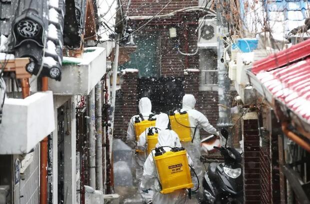 ▲韩国防疫人员不断在社区、街道以及地铁等人员密集场所进行消杀作业。路透社