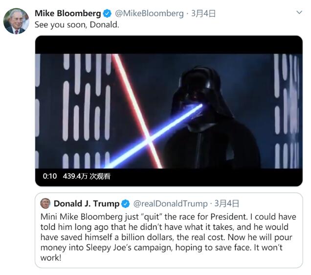据俄罗斯卫星通讯社5日报道,这场“表情包”大战由布隆伯格首先挑起。布隆伯格在推特上发了一段《星球大战》的视频,暗示自己是视频中的正派角色欧比旺,而特朗普则是电影最大反派之一达斯·维德。他还给视频配上了“很快再见,唐纳德”的文字。