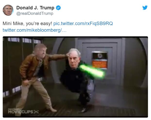 特朗普则用电影《太空炮弹》中恶搞《星球大战》的片段予以回应,将电影中的头号反派“黑帽子大人”P成了布隆伯格,还称“小迈克,你简单得很”。