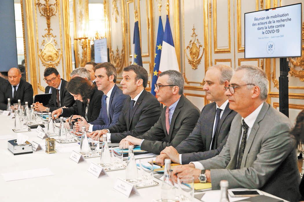 當地時間5 日,法國總統馬克龍在愛麗舍宮會見截至 COVID-19研究人員和專家。 路透社