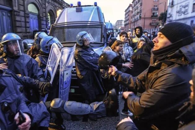 那不勒斯监狱围墙外,警方与囚犯家属之间发生冲突。(图源:英国《镜报》)