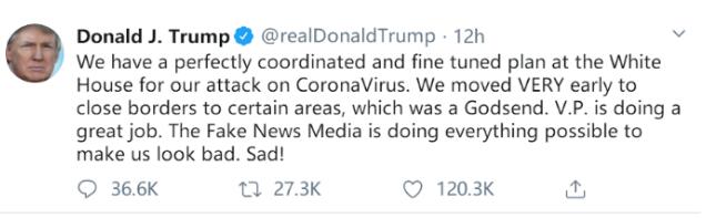 当地时间8日,特朗普在推特上宣称白宫应对新冠病毒“有一个完美协调和很好的调整计划”,他再次强调美国在“很早就封锁了部分边境地区”,还形容该举措是“及时雨”,并称赞副总统彭斯领导抗击疫情表现杰出,同时又将矛头对准“假新闻媒体”,驳斥它们一味抹黑美国政府。