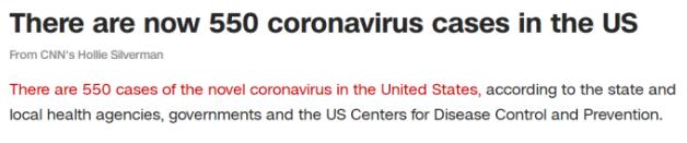 但根据CNN健康频道通过美国公共卫生系统发现和检测的病例统计,美国34个州和哥伦比亚特区累计有480例新冠肺炎确诊病例,加上被遣返的49例,美国新冠肺炎确诊病例累计达到550例,累计21例死亡病例。数据显示:新冠肺炎疫情正在美国不断扩散。