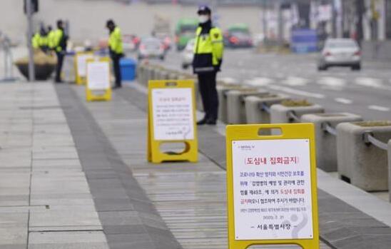图为在光化门广场树立告示牌,要求“停止集会”。 中新社