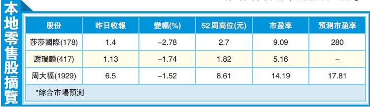 一方面是客人稀少,另一方面為保障員工及顧客安全,多家本地零售商先後宣布,分店暫汀業。當中,莎莎國際(178)、謝瑞麟(417)和周大福(1929)合共近80間分店停業,而謝瑞麟更有逾半在港分店停業,暫未有重開日期。