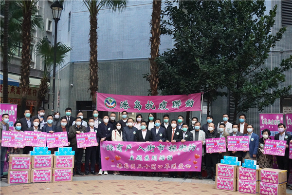 港島抗疫聯動昨日分別向商戶、街市商販、街坊代表致送抗疫物資,隨後,出席的嘉賓向鄰近商戶分派抗疫包。區子安、陳南坡、嚴志峰、邱松慶、劉慶揚、彭勃、陳錦榮,全港抗疫聯線中西區召集人、港島抗疫聯動副召集人葉永成,全港抗疫聯線東區召集人、港島抗疫聯動副召集人黃建彬,全港抗疫聯線灣仔區召集人、港島抗疫聯動副召集人吳錦津,全港抗疫聯線港島區行動組長、港島抗疫聯動副召集人朱立威等出席了活動。