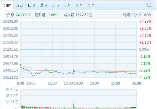 【香港商报网讯】恒指今早重挫探底,早盘大幅裂口低开2.27%报24657点,随后大市直线下挫,盘中最低跌超1110点,低见24117点,创近3年新低,午后继续横盘震荡,三大股指悉数下跌逾3%。