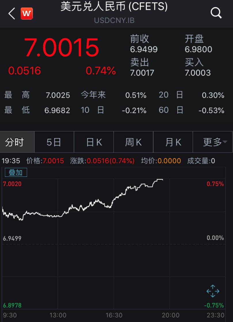 【香港商报网讯】12日晚间,在岸人民币兑美元跌破7关口,日内跌超500个基点,现报7.0015;离岸人民币兑美元短线跳水,稍早前破7,现报7.0179。中国外汇交易中心的数据显示,人民币兑美元中间价下降29点,报6.9641,创逾一周新低。英镑兑美元下挫逾百点,日内跌逾0.7%,现报1.2721。欧元兑美元日内跌幅扩大至0.5%,现报1.1213。