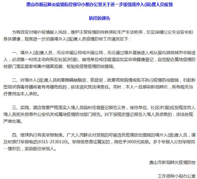 【香港商报网讯】河北唐山市新冠肺炎疫情防控领导小组办公室13日发布关于进一步加强境外入(返)唐人员疫情防控的通告。指出:对境外入(返)唐人员刻意隐瞒接触史、旅居史,故意谎报病情或拒不执行疫情防控措施,引起新型冠状病毒传播或者有传播危险的,依法追究其法律责任。同时,本人一旦感染新冠肺炎,所有相关治疗费用由本人承担。广大人民群众对发现的可能违反疫情防控措施的境外入(返)唐人员,请及时拨打举报电话(0315-2530110)。举报信息查证属实的,将给予3000元奖励。多个举报人分别举报同一情形的,奖励首位举报人。