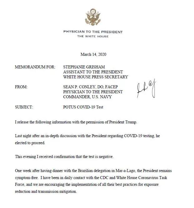 美东时间14日下午,美国总统特朗普在新闻发布会上表示,他13日晚上接受了新冠病毒检测。白宫医生肖恩·康利表示,特朗普总统的新冠病毒检测结果呈阴性。康利指出:“在与巴西代表团在海湖庄园共进晚餐一周后,总统仍无症状。”
