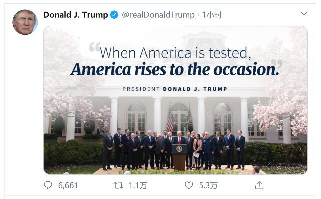 随后,特朗普在推特上发布了一张图,图上写有“当美国经受考验,美国能应对自如(When America is tested America rises to the occasion)”的文字。