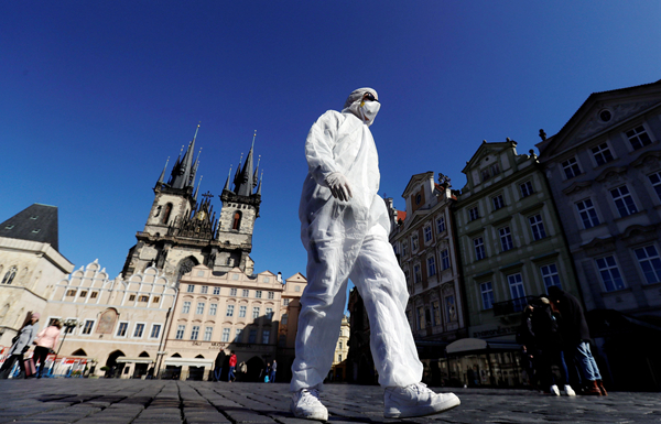 在捷克首都布拉格,一名穿上成套保護服裝的市民在舊城區行走,以免被病毒感染。路透社