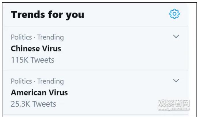 同时观察者网注意到,“特朗普病毒”也成为了推特话题标签。