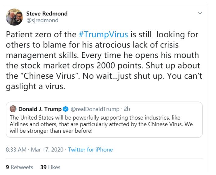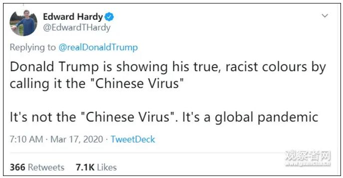 新冠病毒源头尚未查清,但特朗普先是在3月11日晚称之为“外国病毒”,现如今又妄称“中国病毒”,具备明显的歧视色彩,遭到众多外国网民的斥责。