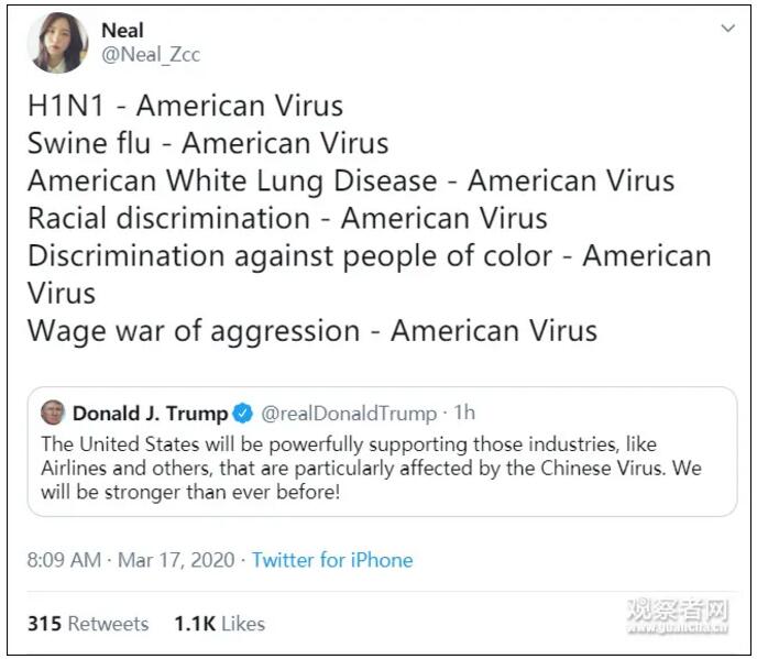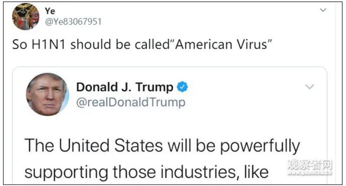 消息一出,“美国病毒”瞬间成为推特热搜词。有人“以牙还牙”,认为甲型H1N1流感病毒应该叫做“美国病毒”。也有人说特朗普才是美国的“病毒”。