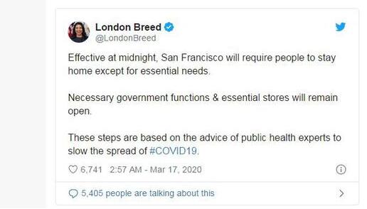 旧金山市长要求市民待在家里,不要外出,相互保持距离。与此同时,来自政府的通知抵达政府各个部门的手上,当天午夜开始执行直到4月7日。