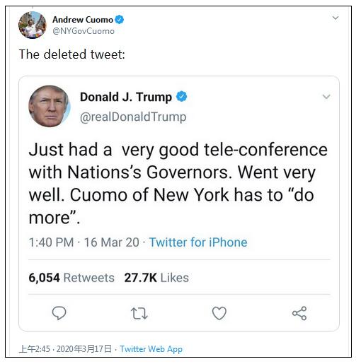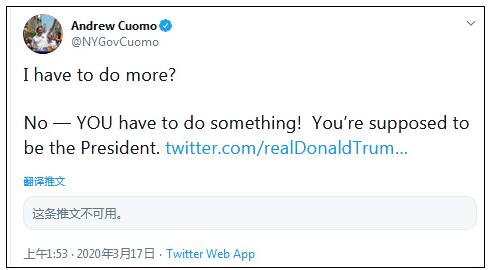 会议结束之后,特朗普发了一条推特,直接点名了纽约州州长。“刚刚给全国的州长们开了一次很好的电话会议。一切都很顺利,纽约州州长科莫必须‘做的多一些’。”