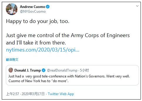 特朗普17日在推特上喊话科莫,必须要“做的多一点”。科莫则很直接地怼了回去,“我再做多点?......你是总统哎。我也是很乐意做你的工作的,把美国陆军工程兵团指挥权给我吧,我立刻就能接手。”