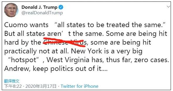 3月17日,特朗普发推点名了日前防疫工作亮眼的纽约州长科默(Andrew Cuomo)称,“科默希望‘所有州都能同等应对’。但并不是所有州都一样。有些受到了所谓‘中国病毒’的严重打击,有些则几乎没有任何影响。纽约州是一个非常大的‘热点地区’,而西弗吉尼亚州到目前为止都没有病例。安德鲁(即科默),别把政治扯进来……”