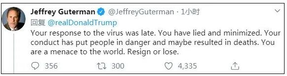 “你对病毒的反应太迟,还撒谎和轻描淡写了。你已经把民众置于危险之中,甚至可能导致死亡。你是全世界的威胁。赶紧辞职,不然也是输。”
