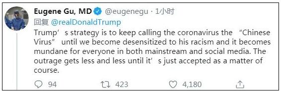 除了顾左右而言他,特朗普在推文中再次妄称“中国病毒”,试图转移针对白宫抗疫不力的指责,但随即受到众多外国网友的斥责。