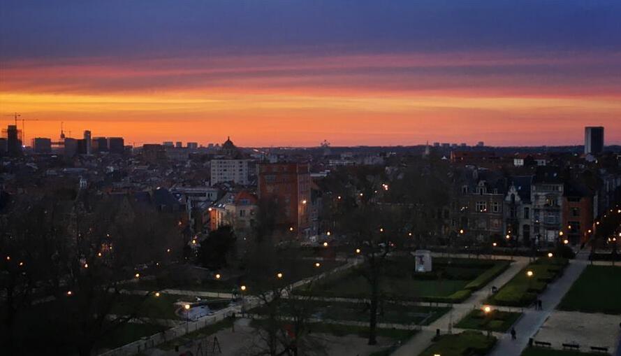 这是3月17日在比利时布鲁塞尔拍摄的傍晚时分的一个公园。新华社