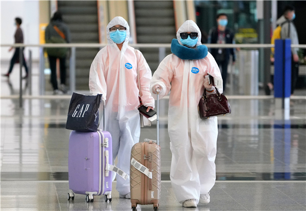 香港昨日新增25宗確診個案,僅3宗無外遊紀錄。圖為乘客穿着防護服抵達香港國際機場。中新社
