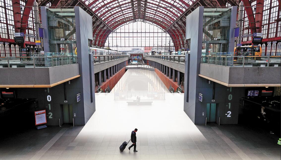 在比利時最大港口城市安特衛普,一名男子拉行李走過空無一人的火車站, 比利時此前已經宣布應對新疫情而封關。路透社