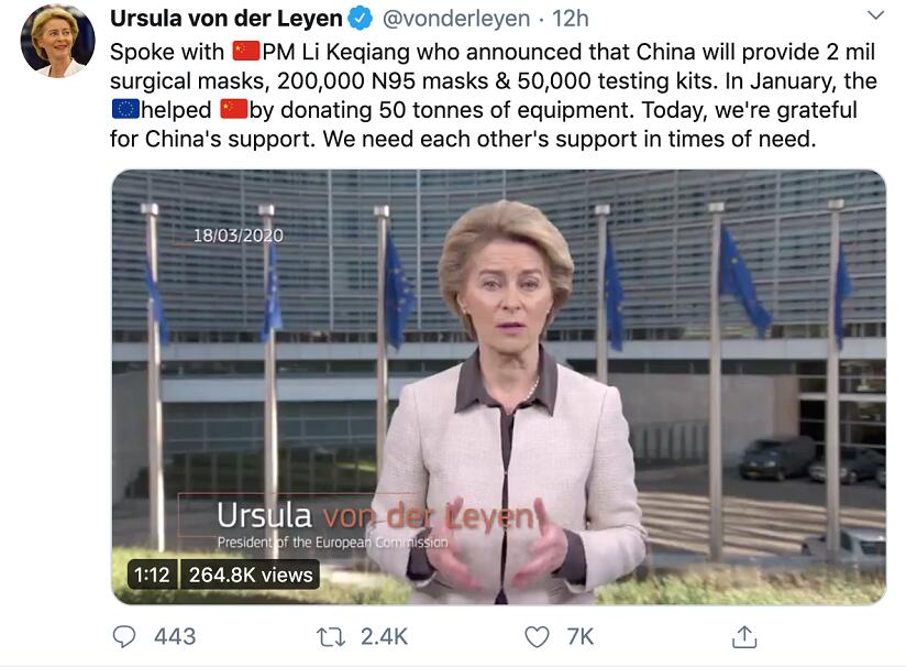 冯德莱恩说,如今,欧盟处于新冠肺炎疫情大流行的“震中”,自身亟需防疫物资。欧盟正在转换生产线,提升有关物资生产能力,但这一过程需要几周时间。欧盟对中国在这一时刻提供支持“高度赞赏、十分感谢”。