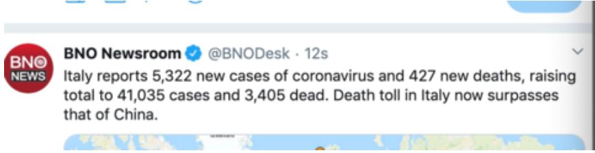 【香港商报网讯】据荷兰媒体BNO新闻网最新消息,意大利新增新冠肺炎确诊病例5322例,创下单日最大增幅,新增死亡病例427例,累计确诊病例增加到41035例,累计死亡病例达到3405例,成为全球因新冠肺炎导致死亡人数最多的国家。