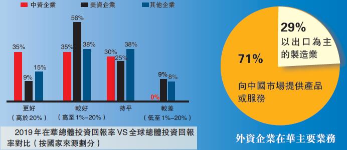 哈利·賽亞丁特別強調,2019年,有九成受調查的美資企業在華總體投資回報率高於或持平於其全球總體投資回報率,而從行業的橫向對比看,無論是製造業、消費品及服務行業,還是提供專業服務的機構,美資企業在中國的總體投資回報率均比全球總體投資回報率高,只有約一成美企投資回報率低於全球平均水平。