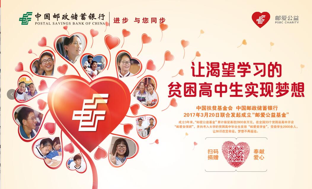 邮储银行于2017年3月20日成立十周年之际设立“邮爱公益平台”,并与中国扶贫基金会联合成立了“邮爱公益基金”,发起“邮爱自强班”项目,为贫困高中生提供教育资金资助及成才支持,同时还在行内成立“公益志愿者协会”,连续三年组织开展“邮爱公益寻访”活动,深入贫困地区实地慰问走访困难学生和家庭。