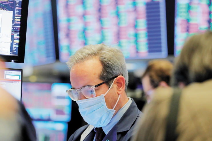 紐交所大樓因新冠病毒爆發而準備無限期關閉,圖為戴着口罩的交易員在工作。資料圖