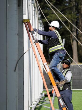 在華盛頓州西雅圖,工作人員將一足球場改建成「方艙醫院」,以應對疫情。路透社