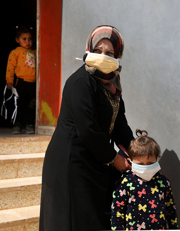 在敘利亞伊德利卜省,一名女子從一個疫情防控知識講座現場出來後給孩子戴口罩。當地時間 22日晚 ,敘衛生部宣布當天在敘境內發現首例感染新型冠狀病毒的確診病例。新華社